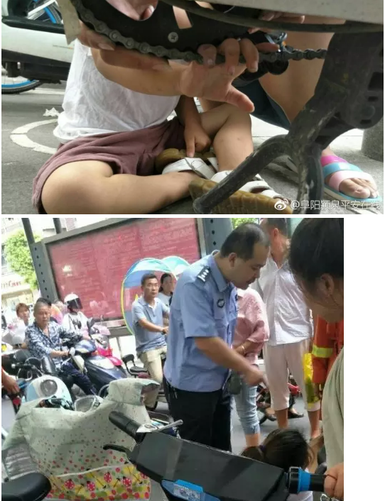 8月19日11时许,在阜城绿色步行街一商店门口附近,一名大约三四岁的儿童手指,被卡在共享自行车的链条里无法动弹,经颍州路派出所民警和消防官兵的联合救助,最终该儿童成功脱险。