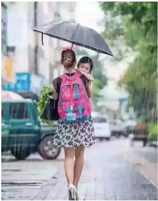 就像下面这张图一样,下了班,踩着高跟鞋,背上娃的书包,右手抱着刚放学的宝贝,左手撑伞,手臂还挂着自己的包和刚买的菜。