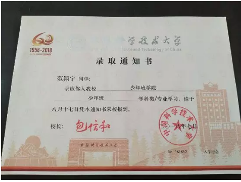 对于太和中学204班的范翔宇而言,他将不会经历“高三”。因为这个夏天,刚念完高二的他通过高考及中国科技大学少年班的资格考试,成为了一名大学生。7月29日,16岁阜阳男孩范翔宇收到了中国科技大学少年班录