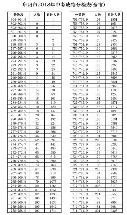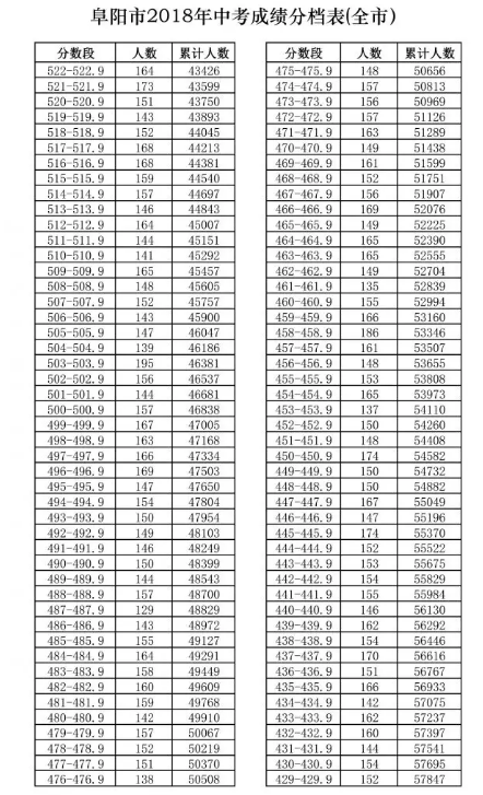 2018年阜阳市中考学生成绩,分档表新鲜出炉,快来看看你家孩子排在多少名!我市2018年普通高中招生建档线公布,最高分490分,最低分330分。各个县市区普通高中招生建档线如下:阜城三区450分、 临
